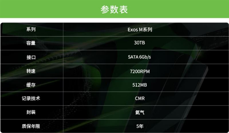 这款硬盘的具体型号是st30000nm004k,标称容量30tb(十进制),采用的是10碟充氦封装单碟容量3tb。