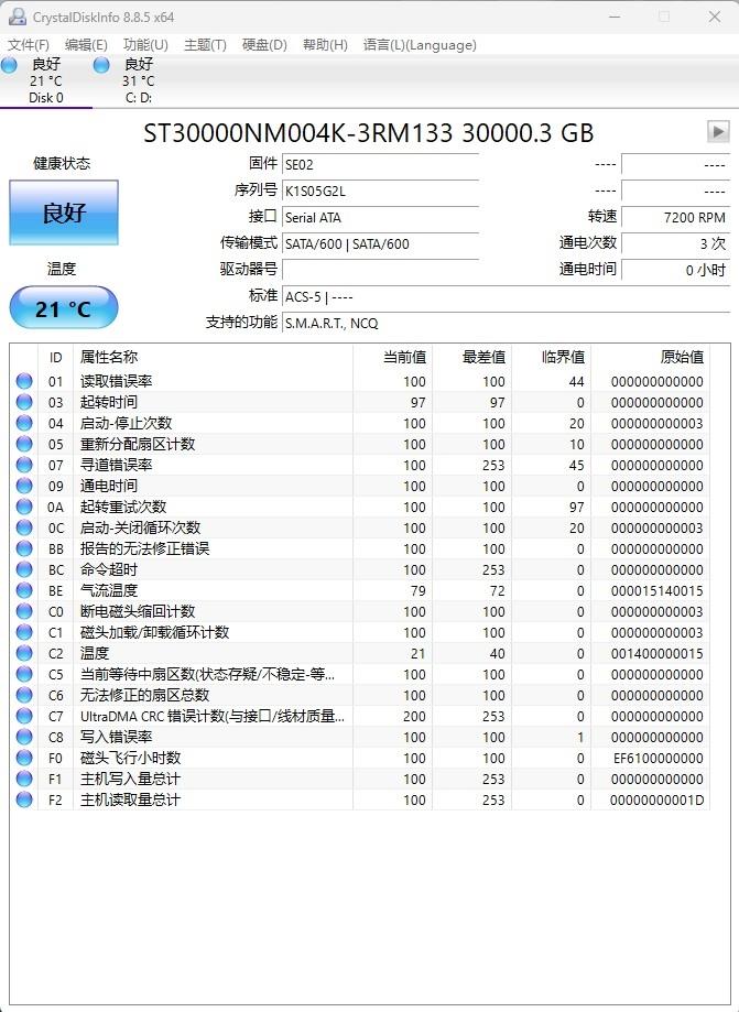 采用crystaldiskinfo软件查看硬盘信息,可以看到固件版本为se02,传输模式sata/600、支持acs-5、支持s.m.a.r.t、ncq,转速7200rpm。