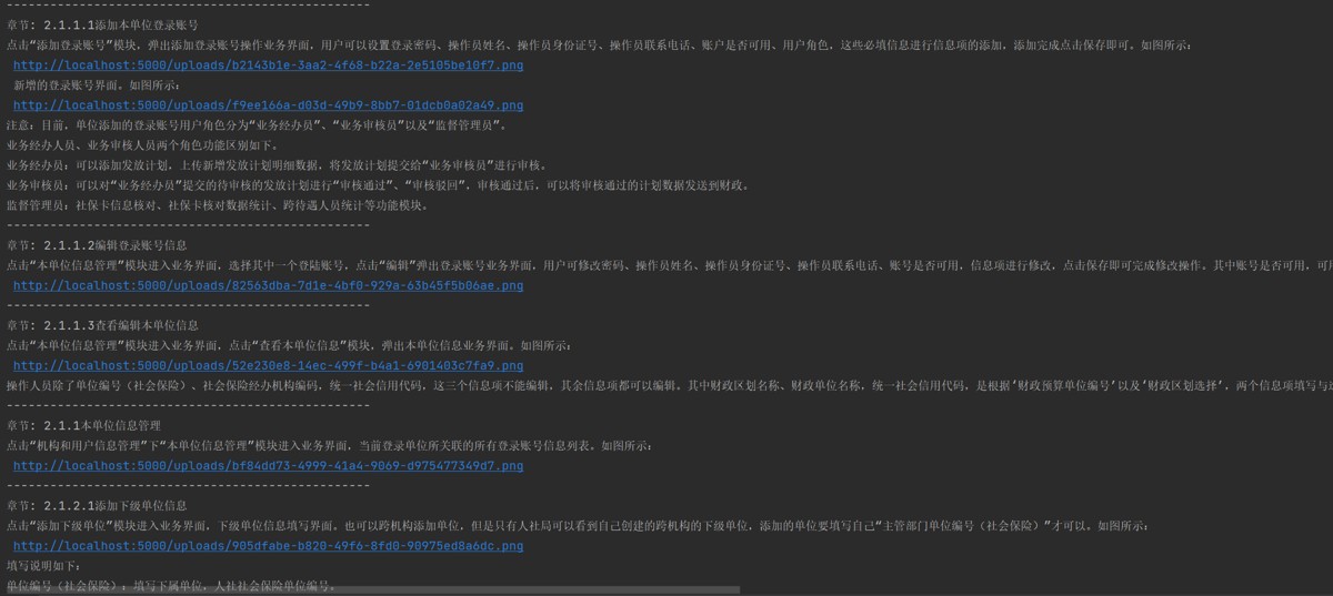 将docx_path替换为实际的word文档路径,upload_url替换为有效的图片上传接口地址(如本地运行的flask应用提供的上传接口)。运行脚本后,你将看到文档按章节切分,图片被正确上传并替换为可访问链接的输出结果。