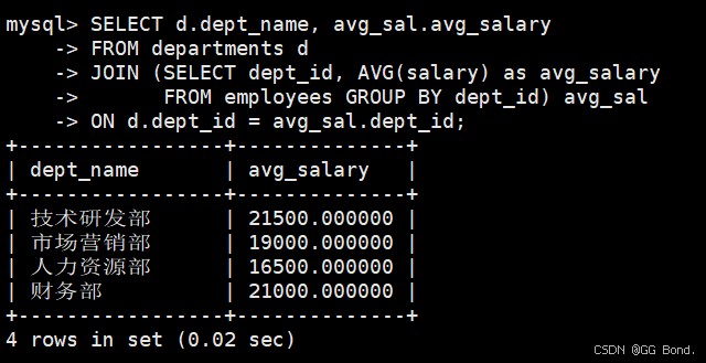 select d.dept_name, avg_sal.avg_salary from departments d join (select dept_id, avg(salary) as avg_salary from employees group by dept_id) avg_sal on d.dept_id = avg_sal.dept_id;