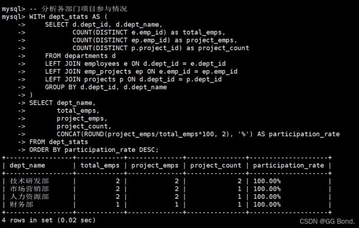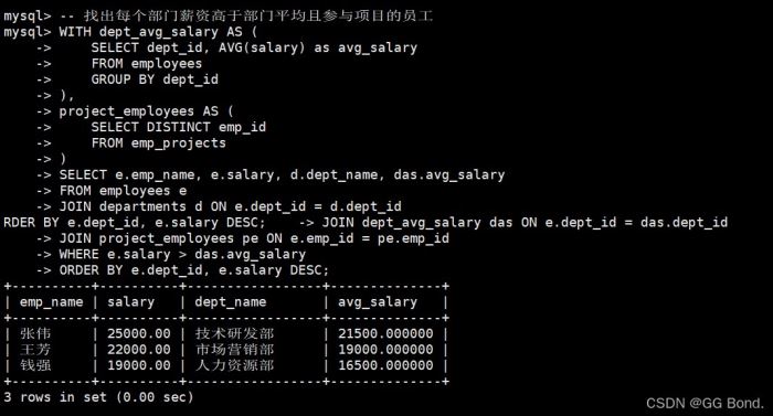 -- 找出每个部门薪资高于部门平均且参与项目的员工