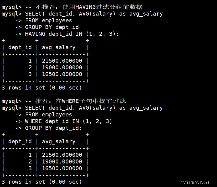 -- 不推荐:使用having过滤分组前数据 select dept_id, avg(salary) as avg_salary from employees group by dept_id having dept_id in (1, 2, 3); -- 推荐:在where子句中提前过滤 select dept_id, avg(salary) as avg_salary from employees where dept_id in (1, 2, 3) group by dept_id;