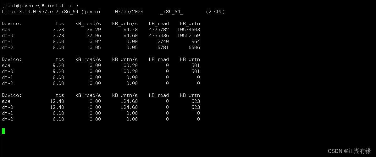 [root@jeven ~]# iostat -d linux 3.10.0-957.el7.x86_64 (jeven) 07/05/2023 _x86_64_ (2 cpu) device: tps kb_read/s kb_wrtn/s kb_read kb_wrtn sda 3.23 38.31 84.79 4775782 10570681 dm-0 3.73 37.98 84.61 4735036 10548247 dm-1 0.00 0.02 0.00 2740 364 dm-2 0.00 0.05 0.05 6781 6606