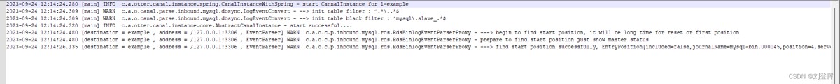 2023-09-24 12:14:24.280 [main] info c.a.otter.canal.instance.spring.canalinstancewithspring - start cannalinstance for 1-example 2023-09-24 12:14:24.309 [main] warn c.a.o.canal.parse.inbound.mysql.dbsync.logeventconvert - --> init table filter : ^.*\..*$ 2023-09-24 12:14:24.309 [main] warn c.a.o.canal.parse.inbound.mysql.dbsync.logeventconvert - --> init table black filter : ^mysql\.slave_.*$ 2023-09-24 12:14:24.320 [main] info c.a.otter.canal.instance.core.abstractcanalinstance - start successful.... 2023-09-24 12:14:24.480 [destination = example , address = /127.0.0.1:3306 , eventparser] warn c.a.o.c.p.inbound.mysql.rds.rdsbinlogeventparserproxy - ---> begin to find start position, it will be long time for reset or first position 2023-09-24 12:14:24.480 [destination = example , address = /127.0.0.1:3306 , eventparser] warn c.a.o.c.p.inbound.mysql.rds.rdsbinlogeventparserproxy - prepare to find start position just show master status 2023-09-24 12:14:26.135 [destination = example , address = /127.0.0.1:3306 , eventparser] warn c.a.o.c.p.inbound.mysql.rds.rdsbinlogeventparserproxy - ---> find start position successfully, entryposition[included=false,journalname=mysql-bin.000045,position=4,serverid=1,gtid=<null>,timestamp=1695526635000] cost : 1634ms , the next step is binlog dump