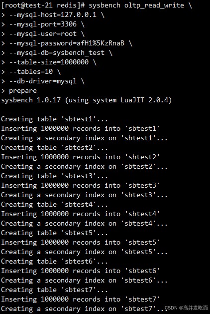 sysbench oltp_read_write \ --mysql-host=127.0.0.1 \ --mysql-port=3306 \ --mysql-user=sysbench \ --mysql-password=sysbench@123 \ --mysql-db=sysbench_test \ --table-size=1000000 \ # 每个表 100 万行 --tables=10 \ # 共 10 个表(总数据量 1000 万行) --db-driver=mysql \ prepare # 准备数据的核心指令