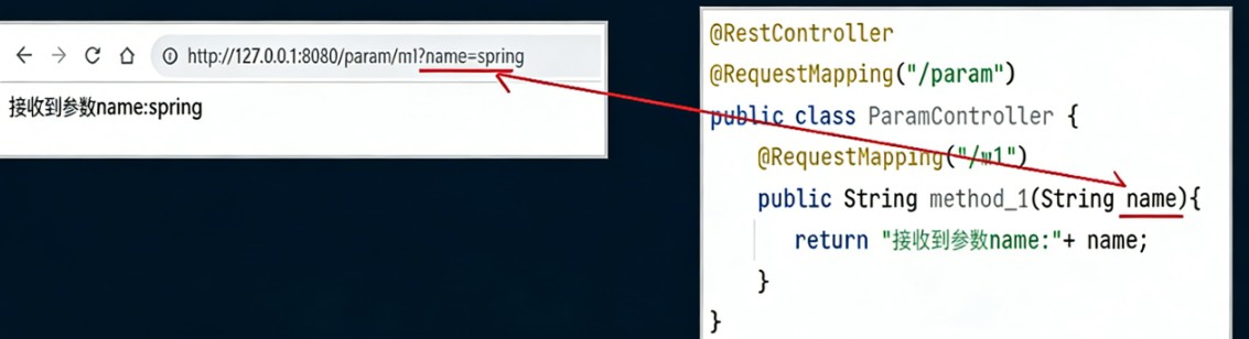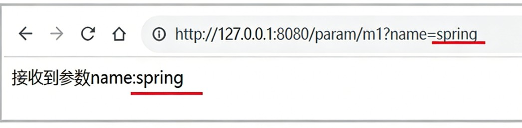 }咱们使用浏览器发送请求并传参http://127.0.0.1:8080/param/m1?name=spring