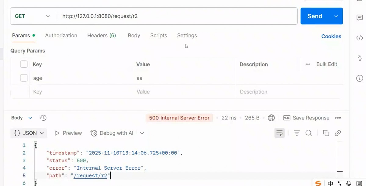 1.不传参数:报了一个500的状态码,我们看后端日志