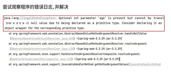 ⼀般看日志堆栈信息的首行,报错信息显示: int类型的参数'age',虽然为可选的,但由于被声明为基本类型而不能转换为空值.考虑将其声明为对应基本类型的包装类型.