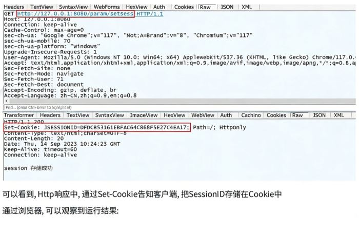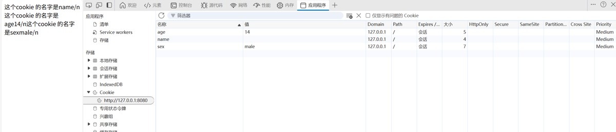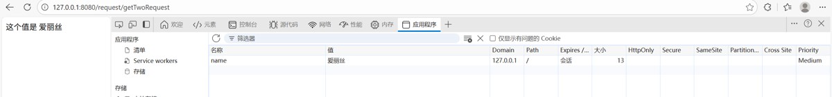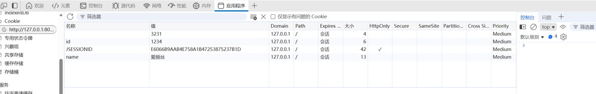 可以看到,http响应中,通过set-cookie告知客⼾端,把sessionid存储在cookie中 通过浏览器,可以观察到运⾏结果: