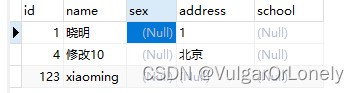 我们可以看到变动为2,此时就是说明原数据进行了更新,更新内容为下面update中设置的字段值 ,id也可变化,数据库中数据如下