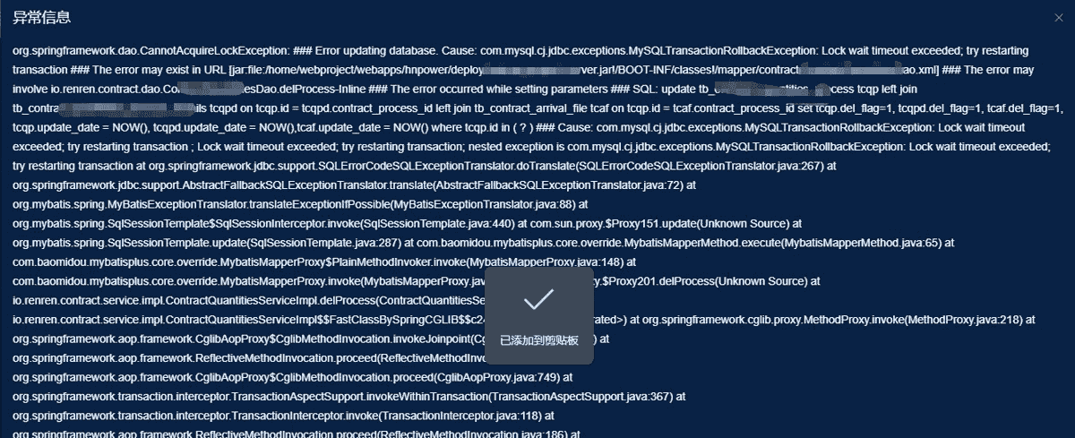 in (?)和多个join。确保tcqp.id、连接条件上的字段(如tcqpd.contract_process_id,tcaf.contract_process_id)都有合适的索引。没有索引会导致锁升级(例如锁表而不是锁行),大大增加锁冲突的概率。 - 使用