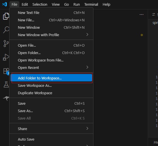 - 或者通过菜单栏:`文件` -> `将文件夹添加到工作区`。