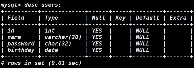 field 为字段名字,type 是字段类型,null 为约束条件,key 索引
