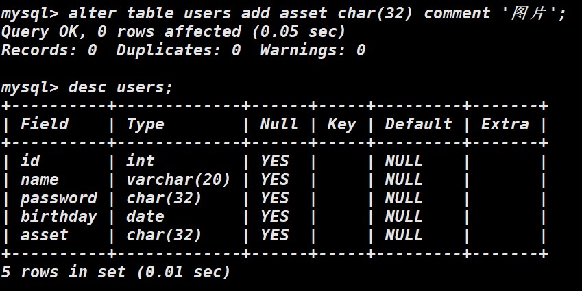 alter table 【表名】 add 【新字段】 【新类型】 【新备注】;
