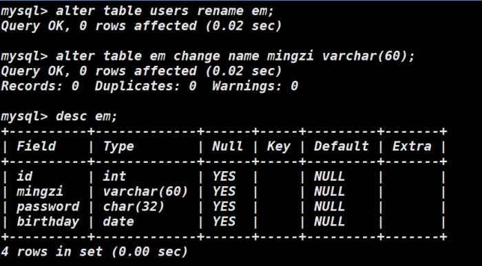 若我们想更改表名或者更改表内的字段名