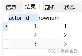 set @rownum := 0; select actor_id, @rownum := @rownum + 1 as rownum from actor order by actor_id limit 3;