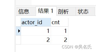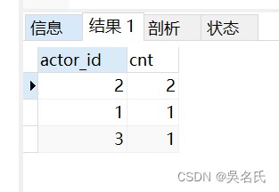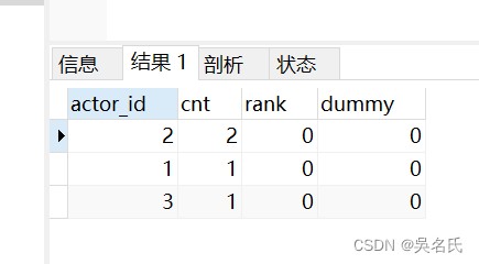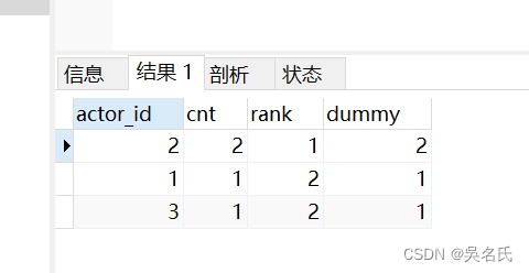 这个例子的实际意义并不大,它只是实现了一个和该表主键一样的列。不过,我们可以把这当作一个排名。现在我们来看一个更复杂的用法。我们先编写一个查询获取演过最多电影的前10位演员,然后根据他们的出演电影次数做一个排名,如果出演的电影数量一样,则排名相同。我们先编写一个查询,返回每个演员参演电影的数量。
