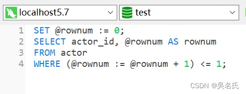 set @rownum := 0; select actor_id, @rownum as rownum from actor where (@rownum := @rownum + 1) <= 1;