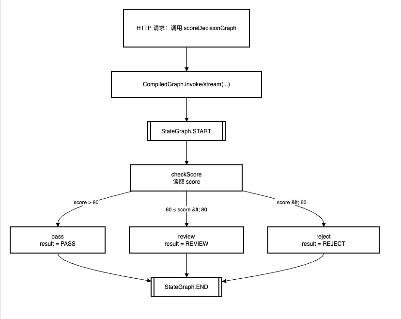 sourceid:条件边的源节点 id,这里是"checkscore";asyncedgeaction:根据当前overallstate计算条件标签,这里返回"pass"/"review"/"reject";mappings:标签与目标节点 id 的映射,例如"pass" -> "pass",即当标签为"pass"时跳到pass节点。