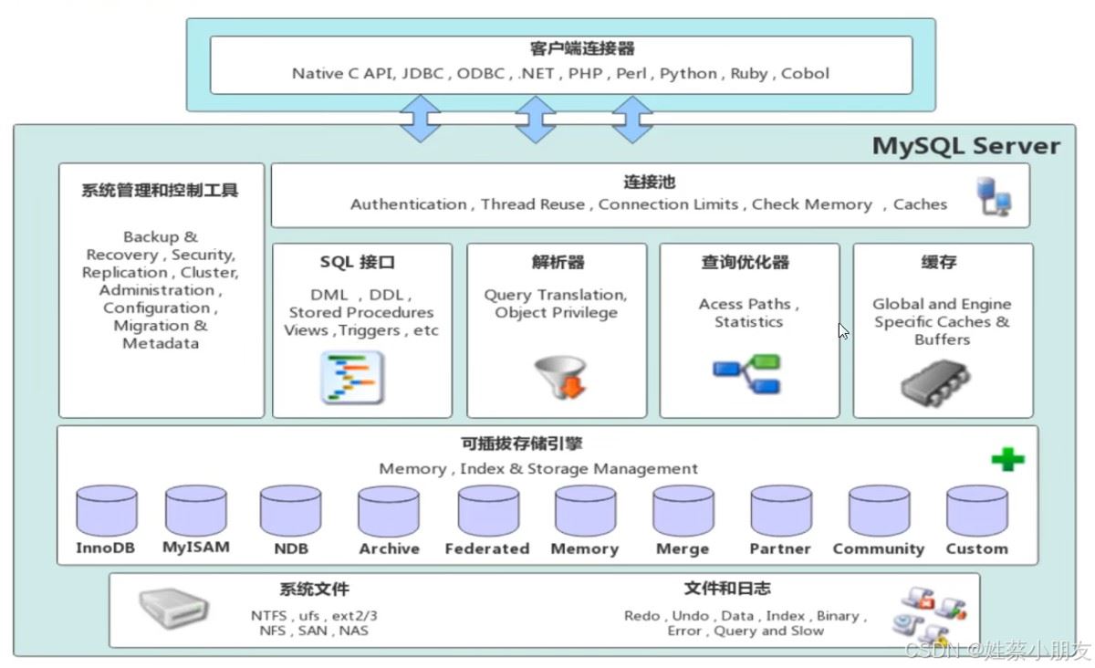 一、mysql服务器结构连接层用于校验jdbc发来的用户名和密码,确认客户端使用的用户名的权限。服务层暴露统一接口检查并处理sql、存储过程、视图、触发器,生成引擎能理解的指令序列。引擎层控制数据的逻