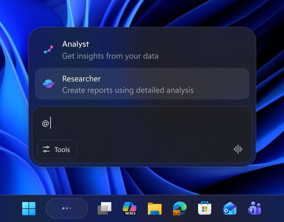任务栏上的 ask copilot 中的分析师和研究员智能体。