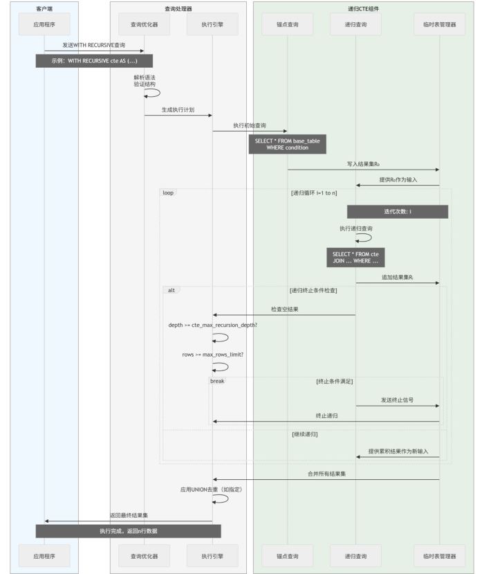 执行时序图展示了cte从查询提交到结果返回的完整交互流程:客户端发送查询后,查询优化器解析并生成执行计划,执行引擎首先执行锚点查询生成初始结果集,随后驱动递归查询进行迭代循环,每次迭代基于前次结果生成新数据集并检查终止条件,最终通过临时表管理器合并所有结果集,应用去重操作后返回给客户端。