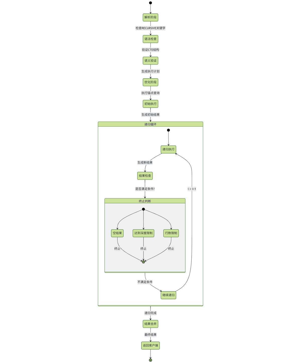 递归cte生命周期图中以状态机形式描述了查询从解析到结束的完整状态流转:始于查询解析阶段的语法验证,经过查询优化生成执行计划,进入初始化执行准备临时数据,核心阶段是递归循环执行,通过迭代计数器控制递归深度并检查终止条件,最后在结果合并处理阶段聚合所有中间数据,完成格式化后返回最终结果,整个生命周期清晰划分了解析、优化、执行和结果处理四个关键阶段。