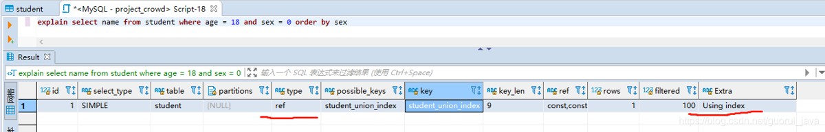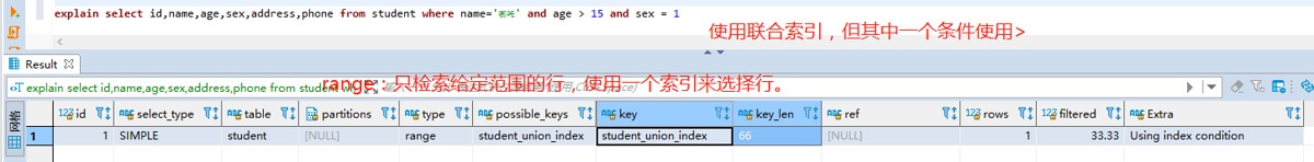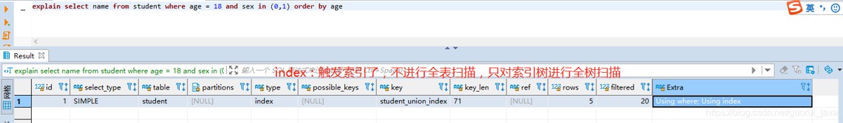 using where:where子句用于限制哪一个行匹配下一个表或发送到客户。除非你专门从表中索取或检查所有行,如果extra值不为using where并且表联接类型为all或index,查询可能会有一些错误。需要回表查询。