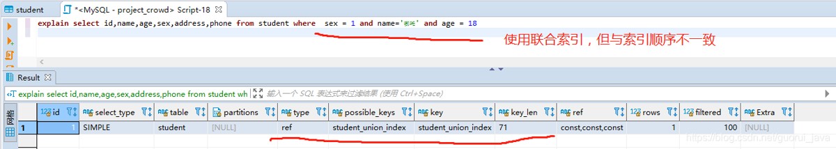 备注:因为mysql优化器的缘故,与索引顺序不一致,也会触发索引,但实际项目中尽量顺序一致。