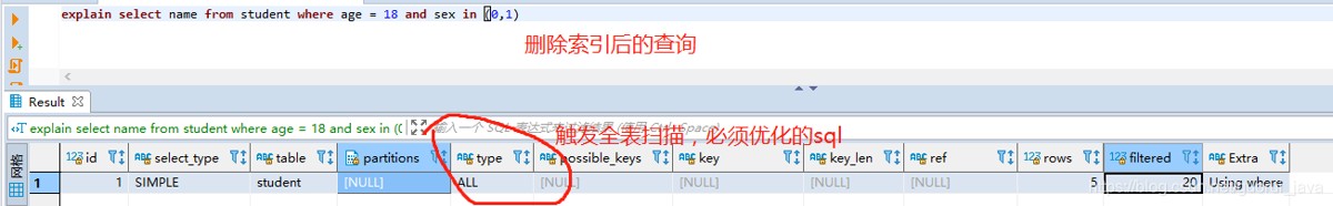 备注:in会导致索引失效,所以触发using where,进而导致回表查询。