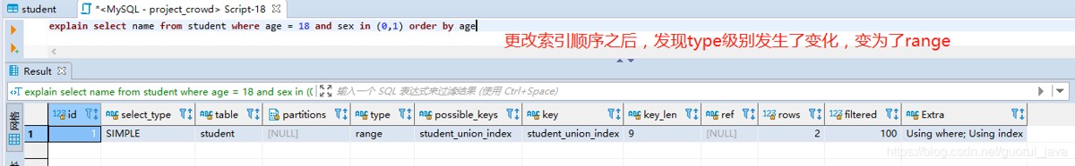 更改索引顺序之后,发现type级别发生了变化,由index变为了range。