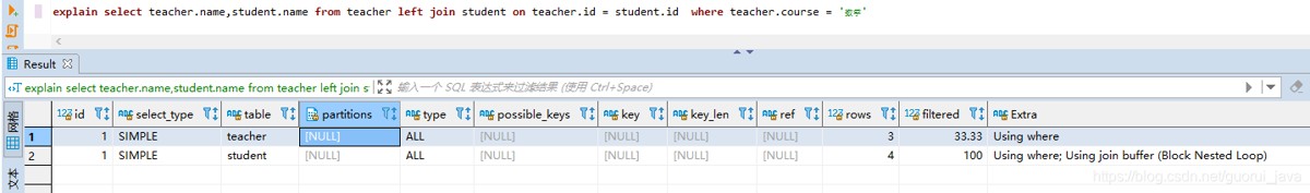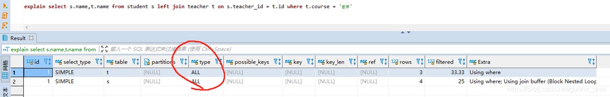 explain select teacher.name,student.name from teacher left join student on teacher.id = student.id where teacher.course = '数学'