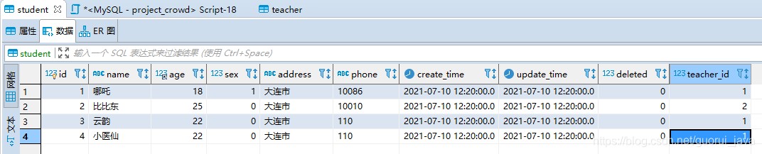 create table `student` ( `id` int(10) not null, `name` varchar(20) not null, `age` int(10) not null, `sex` int(11) default null, `address` varchar(100) default null, `phone` varchar(100) default null, `create_time` timestamp null default null, `update_time` timestamp null default null, `deleted` int(11) default null, `teacher_id` int(11) default null, primary key (`id`) ) engine=innodb default charset=utf8;