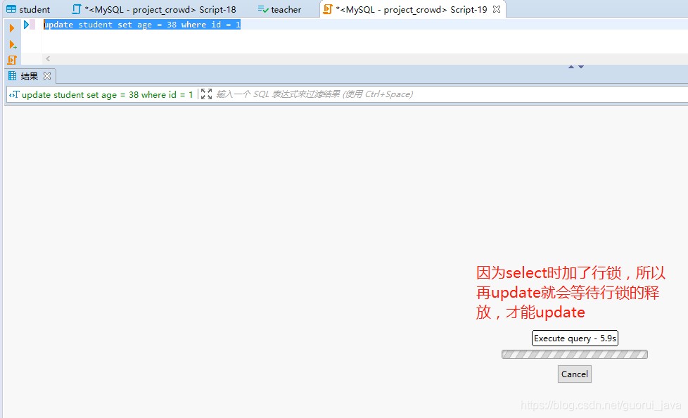 会话1: select * from student; --查,可以 delete from student where id = 1;--增删改,会“等待”会话0将锁释放 会话1: select * from user; --查,可以 delete from user where id = 1;--增删改,可以