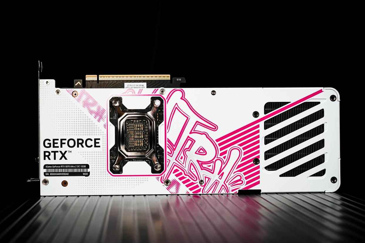 igame rtx 5070 背插显卡背部配备高强度嘻哈背板,为显卡提供额外防护和支撑的同时,还兼具散热效果。背板采用纯白底+经过特别设计的桃粉“ultra”涂鸦字体,彰显嘻哈元素。侧面的大面积镂空更利于风道流通,便于显卡内部热空气快速排出。