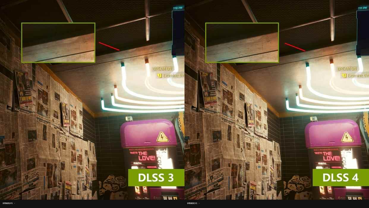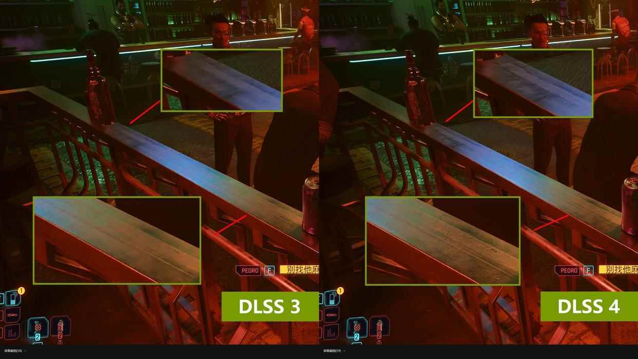 下面来看看使用cnn模型的dlss 3与使用transformer模型的dlss 4在画面上的对比。
