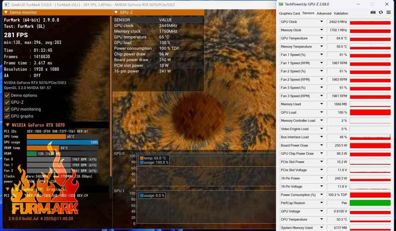 igame rtx 5070 背插显卡在半小时左右的烤机测试中gpu温度为65℃左右;显存温度为56℃;风扇转速1967 rpm(61%)。另外可以看到在tdp 100%的满载情况下,整卡功耗为250w。