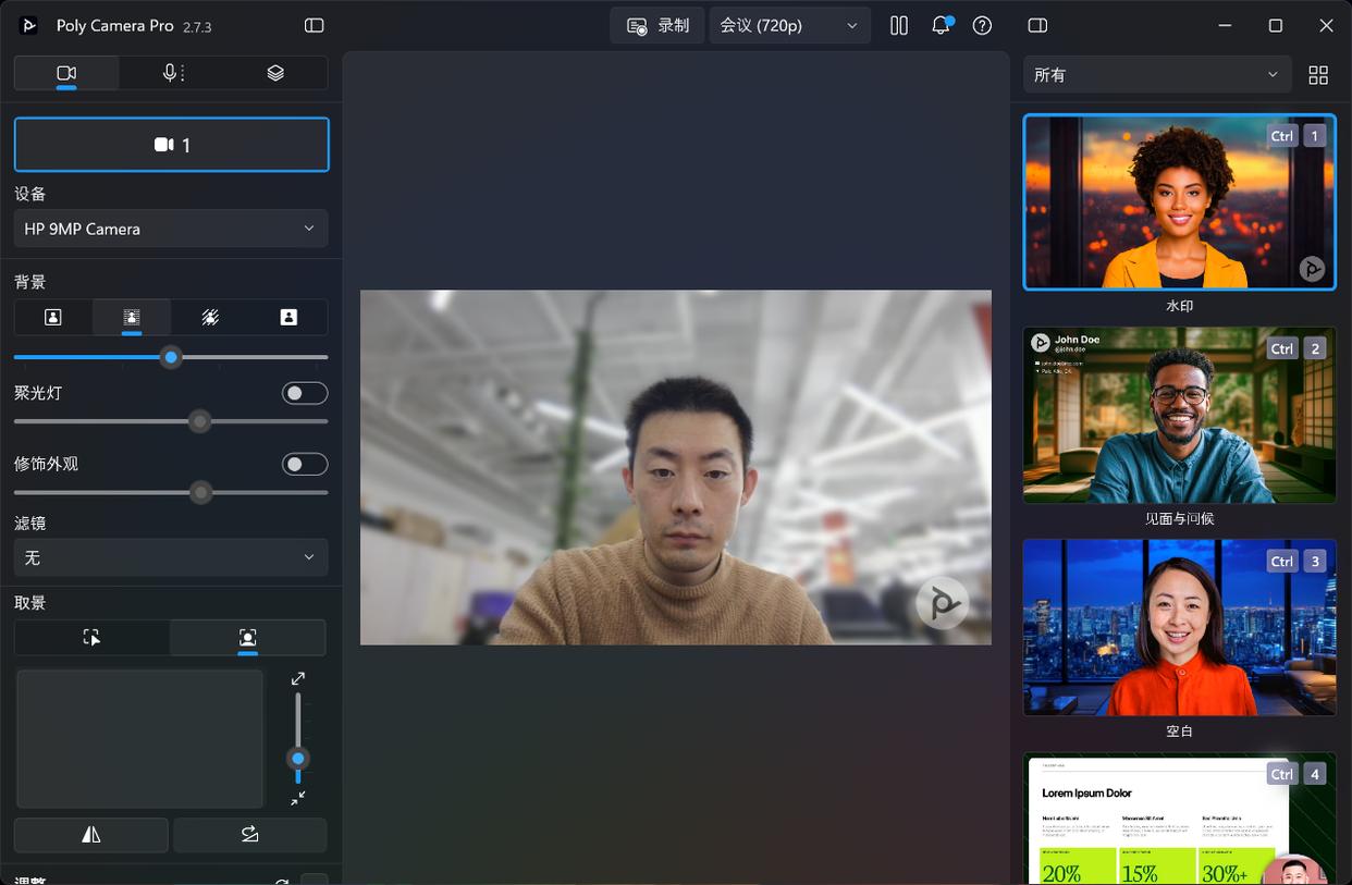 poly camera pro对于惠普轻薄本用户来说并不陌生,这是一款功能强大的视频中间层软件,它提供了包括背景虚化、聚光灯、修饰外观、滤镜、自动取景、预设模板等功能,几乎涵盖视频会议中所需的所有功能。而且大多数功能实现基于ai,并运行在npu上,效果更出色,而且更省电。此外,所有功能完全免费,并且完美支持第三方会议软件调用,极为方便。