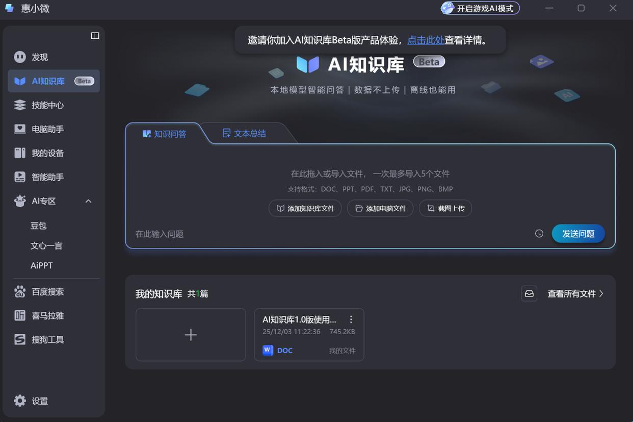 同时它还提供了本地ai知识库,完全通过本地大模型处理,支持多种文档格式,数据不上传,离线也能用,方便你搭建属于自己的“ai图书馆”。它通过本地大模型,将用户存储的文档内容提炼、整理,就像一名聪明、勤快的专家级私人助理,第一时间将所有的内容消化完全,这时候用户只需要提问就能够获取到有用且经过总结后的信息,非常好用。惠小微还提供了会议笔记、字幕翻译、语音录入等实用功能,对于经常开会,特别是跨国会议等场景,智能助手可以协助用户更轻松的理解、完成工作。