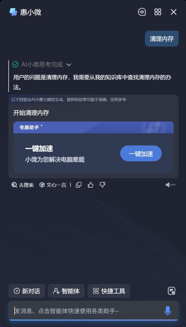 惠小微还能解决电脑设置和维护方面的问题,这多亏了惠普售后多年的经验积累,再加上ai的赋能,无论是电脑加速还是硬盘分区这种需要专业知识的操作,惠小微都可以协助用户完成。