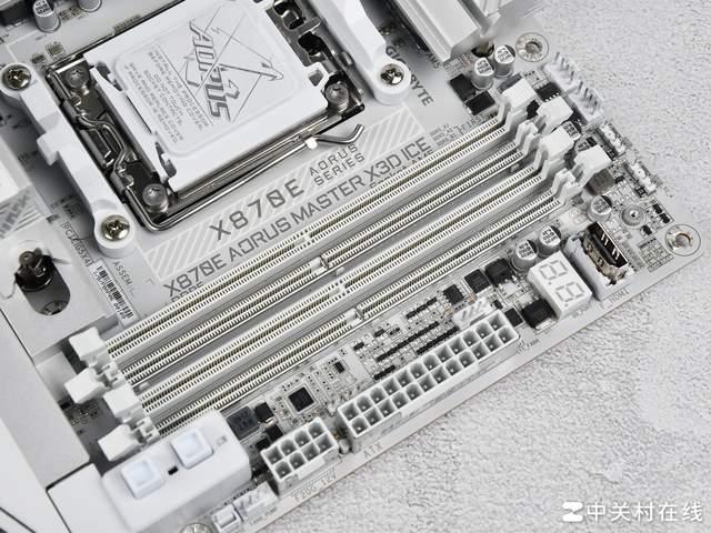 技嘉 x870e aorus master x3d ice主板还提供4组白色ddr5内存插槽,最高支持ddr5 9000,最大容量可达256gb,并且技嘉采用一体成型抗干扰金属遮罩设计,既加固了内存插槽,又能优化信号完整性与超频潜力。