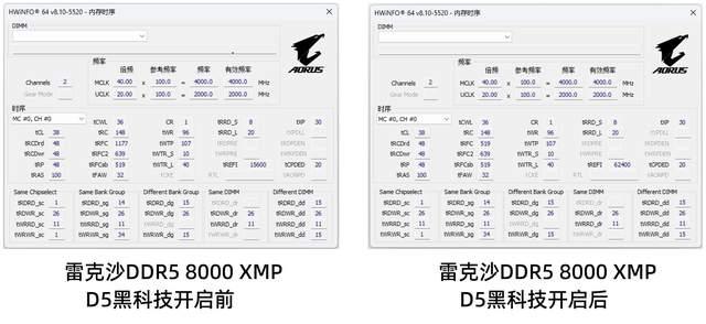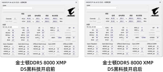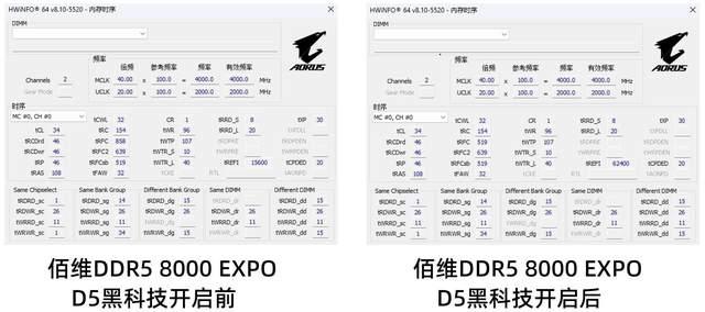 我们接下来给大家首先展示一下开启xmp/expo高频宽测试的这4款内存时序变化,同时我们打开这4款内存本身的expo/xmp预设,实现了xmp 8000mt/s超频和expo 6000mt/s超频。