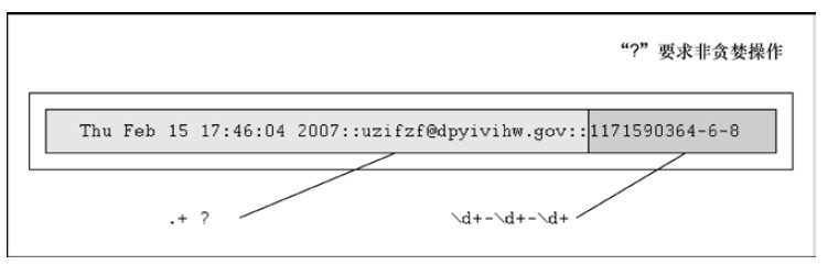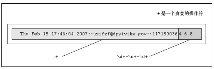 “.+”获取从字符串起始位置开始的全部单个字符,包括所期望的第一个整数字段。\d+仅仅需要一个数字,因此将得到“4”,其中.+匹配了从字符串起始部分到所期望的第一个数字的全部内容:“thu feb 15 17:46:04 2007::uzifzf@dpyivihw.gov::117159036”,如图1-2 所示。