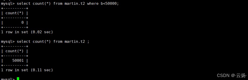 select count(*) from martin.t2 where b<50000; -- 应返回0 select count(*) from martin.t2; -- 应返回50001