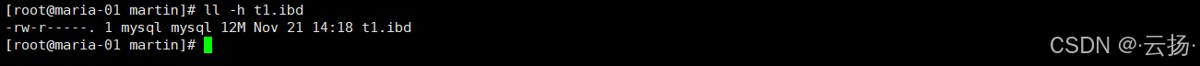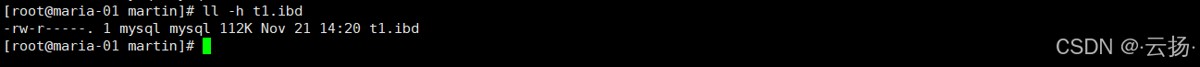# 进入mysql数据目录(需根据实际路径调整,此处为/data/mysql/data/martin) cd /data/mysql/data/martin # 查看t1.ibd大小(-h表示人性化显示,如kb/mb) ll -h t1.ibd