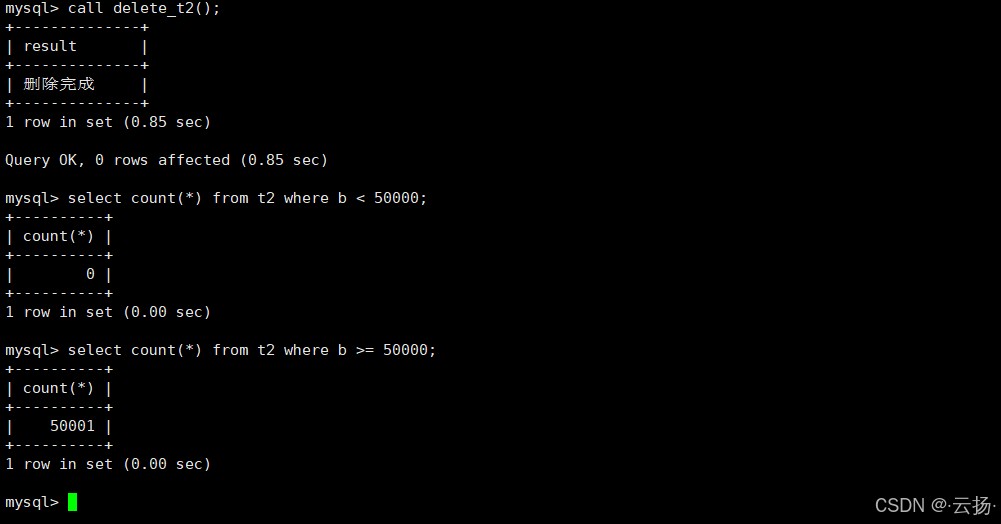 -- 确认删除效果(应返回0) select count(*) from t2 where b < 50000; -- 剩余数据量(应返回50000) select count(*) from t2 where b >= 50000;
