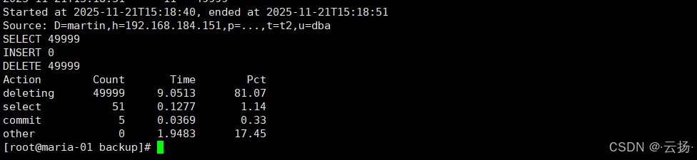 pt-archiver \ --source h=192.168.184.151,u=dba,p='id81gdac_a',d=martin,t=t2 \ # 源表信息 --where "b<50000" \ # 删除条件 --progress 10000 \ # 每处理10000行显示进度 --limit=1000 \ # 每次处理1000行 --txn-size 10000 \ # 每10000行提交一次事务 --no-safe-auto-increment \ # 不修改自增主键(避免影响后续插入) --statistics \ # 输出统计信息(如处理时间、行数) --purge # 仅删除,不归档(核心参数)