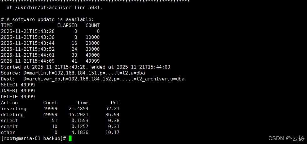 # 关闭归档库的防火墙(避免连接失败) iptables -f # 仅测试环境,生产环境需配置白名单 # 执行归档+删除 pt-archiver \ --source h=192.168.184.151,u=dba,p='id81gdac_a',d=martin,t=t2 \ # 源表 --dest h=192.168.184.152,u=dba,p='id81gdac_a',d=archiver_db,t=t2_archiver \ # 归档表 --where "b<50000" \ # 归档条件 --progress 10000 \ # 进度显示 --limit=1000 \ # 每次处理1000行 --txn-size 10000 \ # 事务大小 --no-safe-auto-increment \ --statistics \ --purge # 归档后删除源表数据