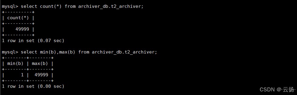select count(*) from archiver_db.t2_archiver; -- 应返回49999 select min(b),max(b) from archiver_db.t2_archiver; -- 应返回1和49999