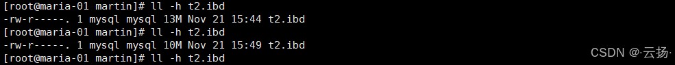 再执行ll -h t1.ibd,结果:文件大小仍为12mb,无变化。